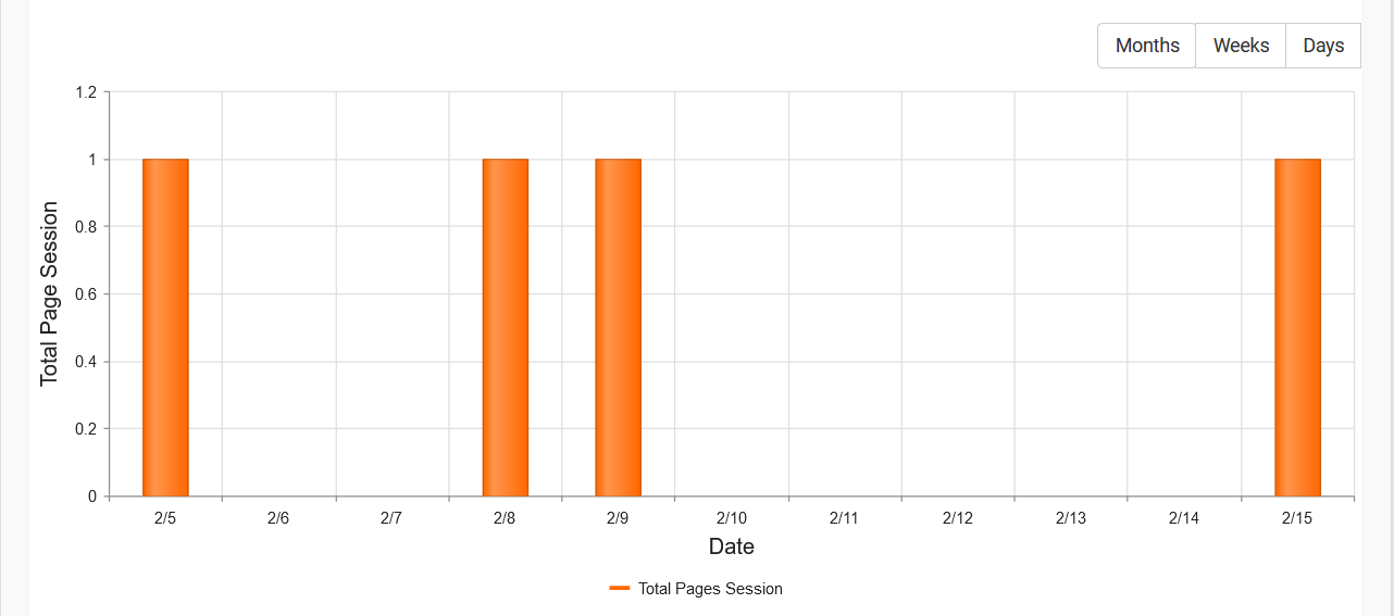Administrative user will be able to see bar graph with total page views by date if "days" filter is selected. If administrative user will select "month" filter, page views will be shown by month in the graph. If administrative user will select "weeks" filter, page views will be shown by weeks of the month. |
