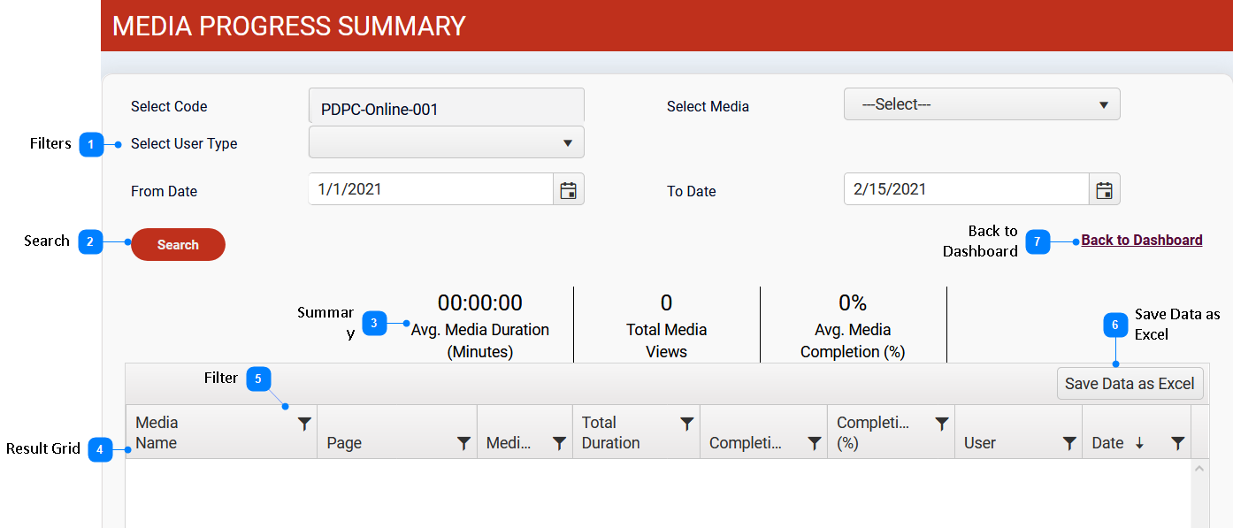 Click the Search button to run the general analytical summary for media progress detail based on the filter(s) selected. |