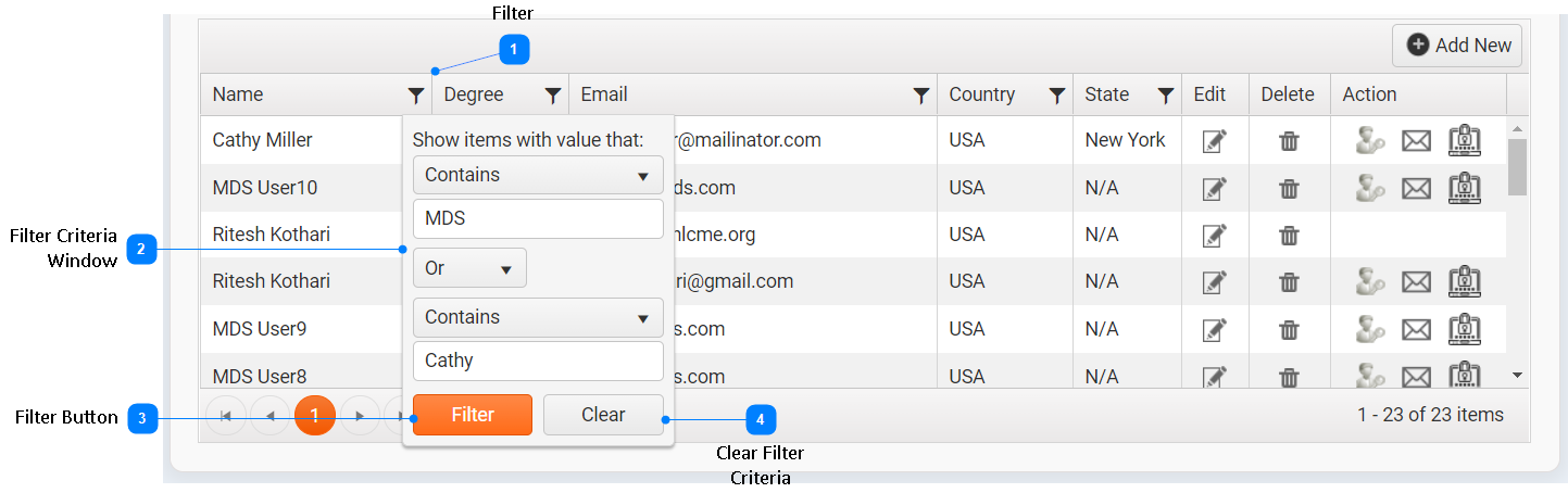 Filters are provided for almost all listing grids available in MDS LMS system. Each column header are filterable and based on search keyword; listing grid will provide search results.